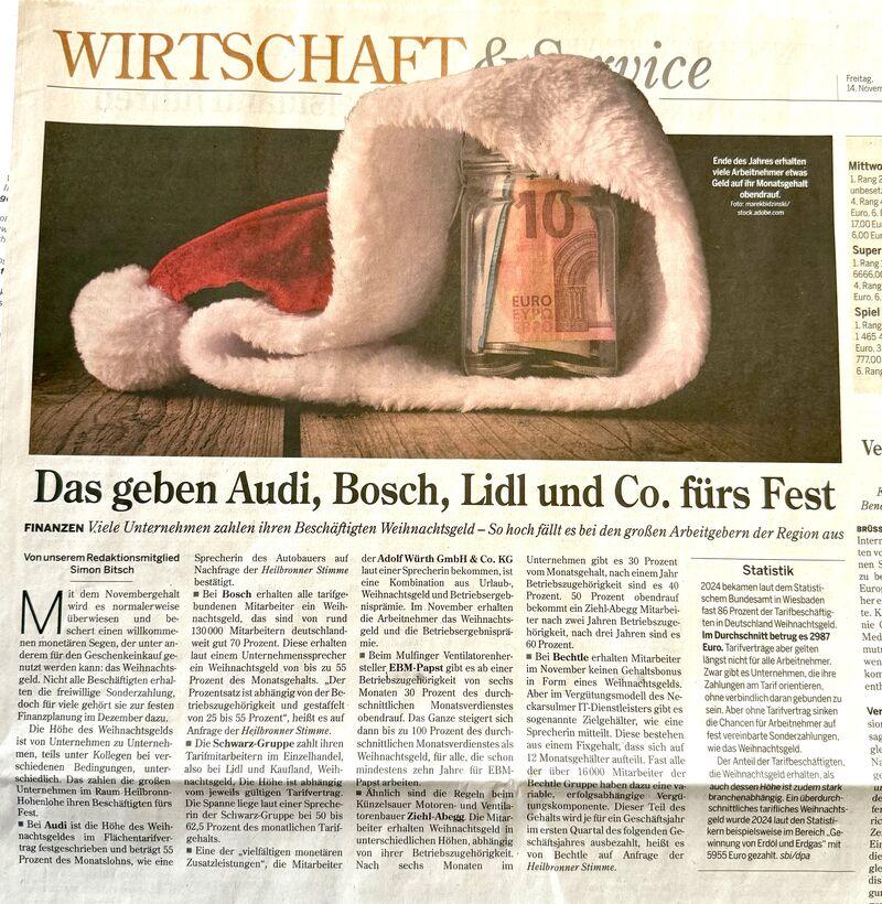 Heute lese ich in der Heilbronner Stimme dass Unternehmen wie AUDI, BOSCH, LIDL und andere auch dieses Jahr - entsprechend ihren Regelungen - bis zu 100 % Weihnachtsgeld auszahlen.