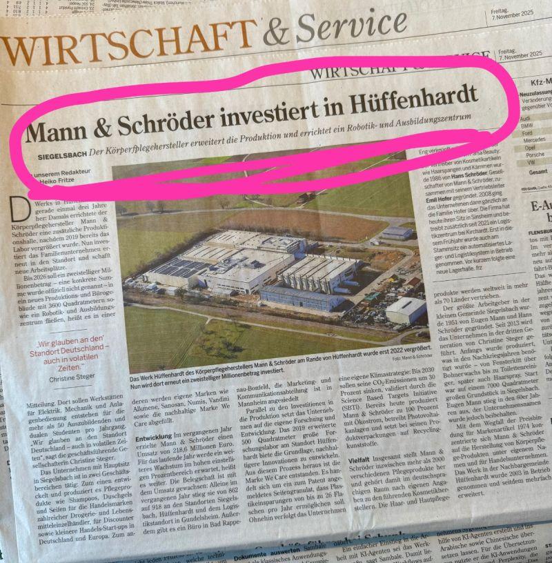 Das sind erfreulich gute Zukunftsimpulse aus Siegelsbach: 🚀 MANN & SCHRÖDER COSMETICS GROUP investiert unter anderem in ein neues Robotikzentrum am Standort Hüffenhardt.