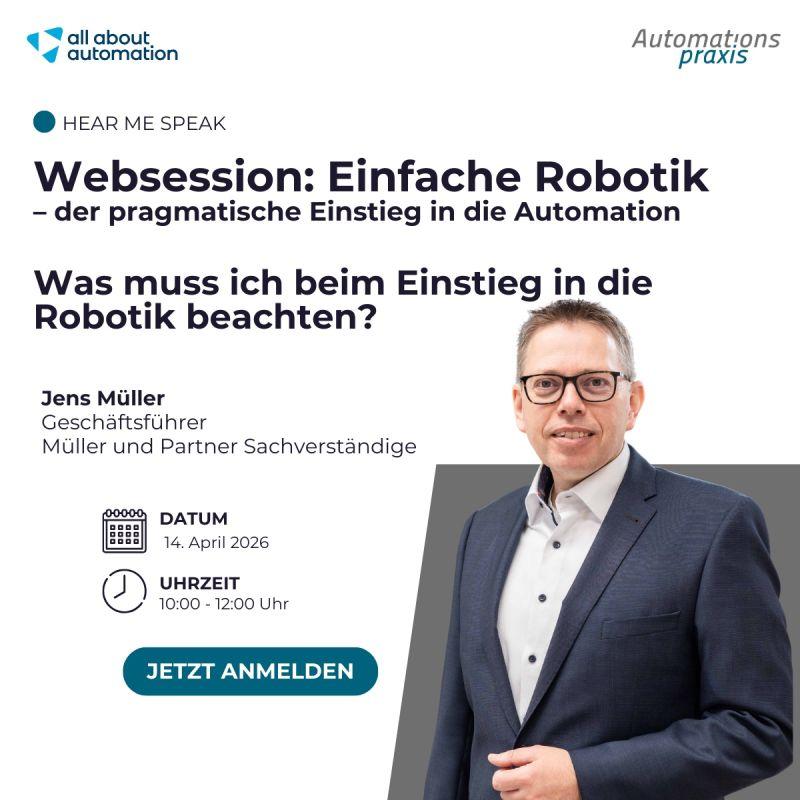 In der Websession „Einfache Robotik“ am 14. April 2026 (10:00–12:00 Uhr | kostenlos | digital) zeigen die Automationspraxis gemeinsam mit der Regionalmessereihe all about automation, wie der Einstieg konkret gelingen kann.