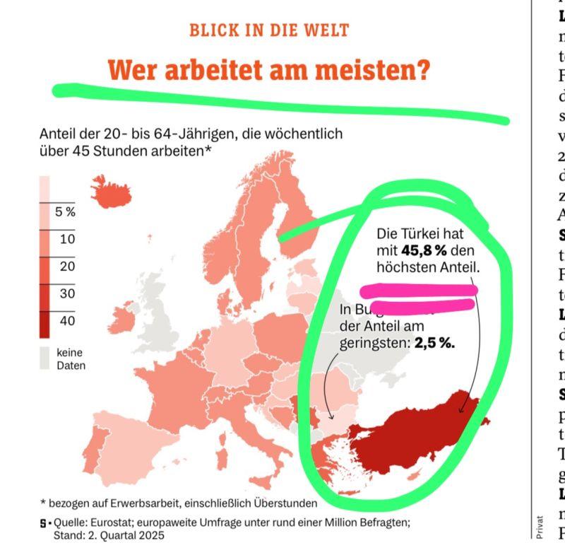 Fast die Hälfte aller Erwachsenen in der Türkei arbeitet mehr als 45 Stunden pro Woche. In Bulgarien tut das gerade mal jeder Vierzigste. Dazwischen ganz Europa, irgendwo zwischen „Präsenz-Marathon“ und „klarer Feierabendgrenze“.