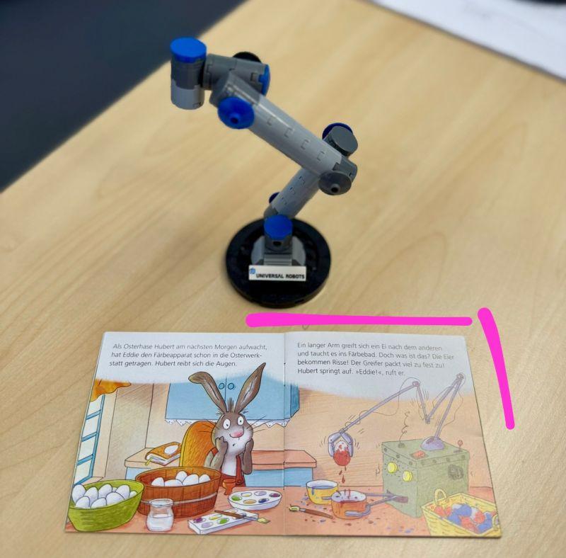 Und ja - die Szene stammt tatsächlich aus einem Pixi-Buch über die automatisierte Eierfärbung vom Erfinderhasen „Eddie“.